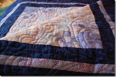 It has been raining lately and it is still too wet to lay it out for proper photo-taking, so here are a few close-ups of the stunning machine quilting by Mary Vaneecke. We chose a gorgeous variegated blue thread. Because of the strong geometry and symmetry, I chose a delicious meandering swirl pantograph.